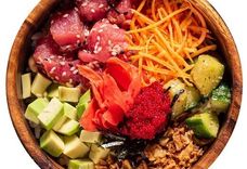 Рис поке, тунец в соусе понзу, авокадо, битые огурцы, морковь, имбирь, лук фри, нори, кинза, тобико, кунжут, соус азиатский айоли, соус кунжутно-ореховый. Poke rice, tuna in ponzu sauce, avocado, crushed cucumbers, carrots, ginger, fries, nori, cilantro, tobiko, sesame seeds, Asian aioli sauce, sesame-nut sauce