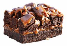 Шоколадный десерт с мягкой карамелью, цельным миндалем и грецким орехом. Chocolate dessert with soft caramel, whole almonds and walnuts.