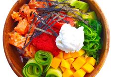 Рис поке (200 г), лосось (100 г), авокадо, сыр творожный, огурец, манго, чука салат, имбирь, нори, тобико, кунжут, соус айоли, соус соевый Poke rice (200 g), salmon (100 g), avocado, curd cheese, cucumber, mango, chuka salad, ginger, nori, tobiko, sesame seeds, aioli sauce, soy sauce