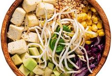 Рис поке (200 г), тофу (100 г), авокадо, кукуруза, коул слоу, арахис, соевые ростки, кунжут, соус сладкий манго-чили. Poke rice (200 g), tofu (100 g), avocado, corn, cole slow, peanuts, soy sprouts, sesame seeds, sweet mango chili sauce.