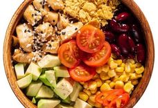 Рис поке, курица, бобы эдамаме, авокадо, черри, кукуруза, фасоль красная, чили, начос, кунжут, соус айоли, соус терияки. Poke rice, chicken, edamame beans, avocado, cherry tomatoes, corn, red beans, chili, nachos, sesame seeds, aioli sauce, teriyaki sauce