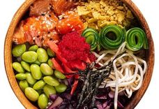 Рис поке (200 г), лосось в соусе понзу (100 г), бобы эдамаме, коул слоу, огурец, имбирь, начос, нори, соевые ростки, тобико, кунжут, соус айоли, соус соевый. Poke rice (200 g), salmon in ponzu sauce (100 g), edamame beans, cole slow, cucumber, ginger, nachos, nori, soy sprouts, tobiko, sesame seeds, aioli sauce, soy sauce.